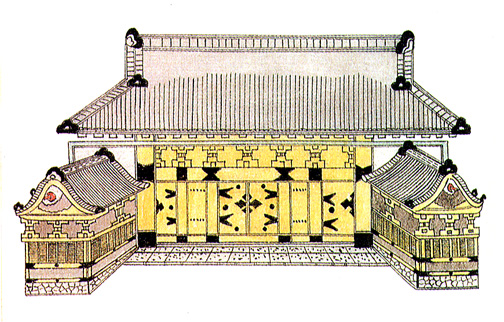 guard boxes on both sides reflect the daimyo's status. The gate