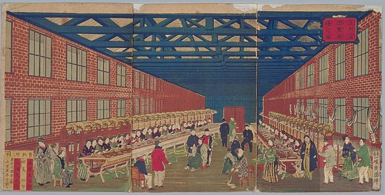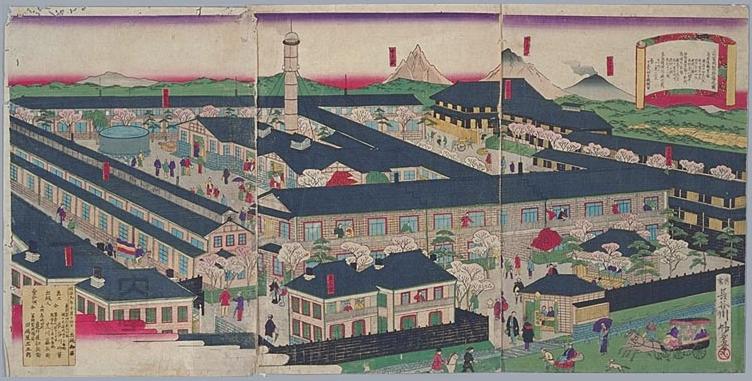 Hasegawa Kawatake print of factory Photograph from Tokyo National Museum contrast this with older physical structures